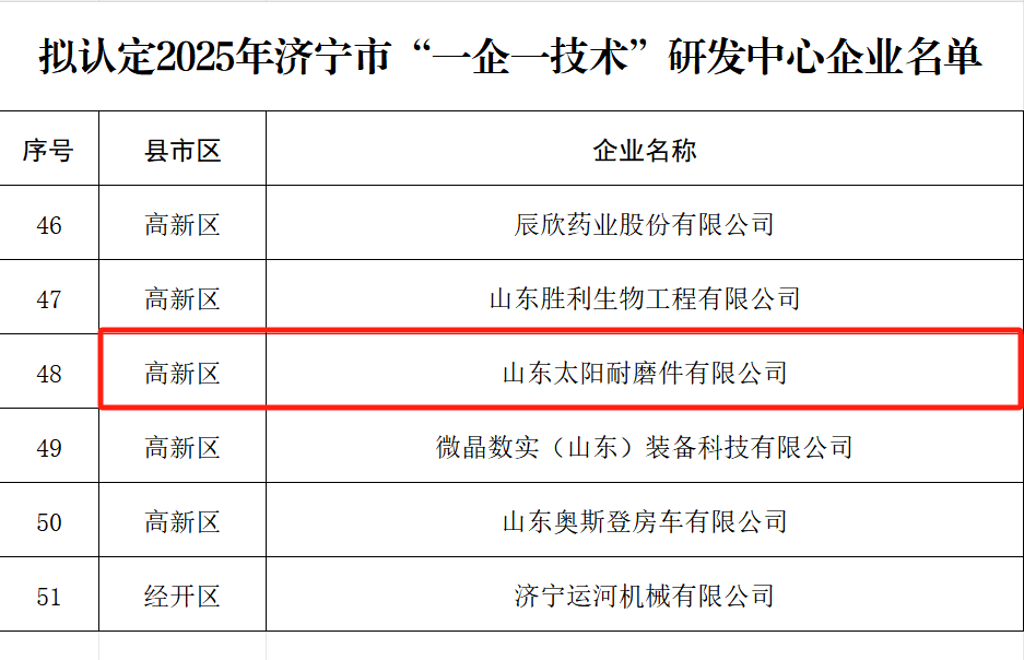Recently, the Industry and Information Technology Bureau of Jining City announced the list of "One Enterprise, One Technology" R&D center enterprises in Jining City for 2025, and Sun Wear resistant Parts Co., Ltd. was successfully selected.